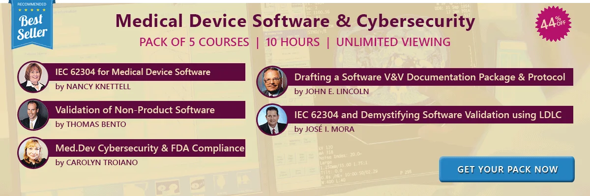 Medical device software can make or break a device. Badly developed, non-compliant software can compromise a device's safety and reliability. The goal is that upon completion of this pack of courses, you should understand how to create and maintain safe software for medical devices throughout their life cycles. In addition to this, you should also understand how IEC 62304 interlinks with other standards such as ISO 14971 and ISO 13485.